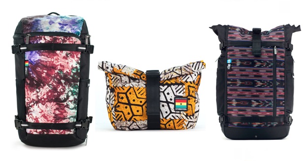 左からガーナのスレッドをあしらった「プレムジパック」、コンパクトなスリングタイプの「シクロトラベルスリング」。こちらもガーナ。そして、グアテマラの「ラージャパック」。