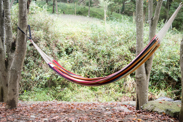 アマゾナスのブラジリアンハンモック。コットンの比率が高いので肌触りがよく通気性もいい。そよそよと背中を通る風の心地よさといったら。