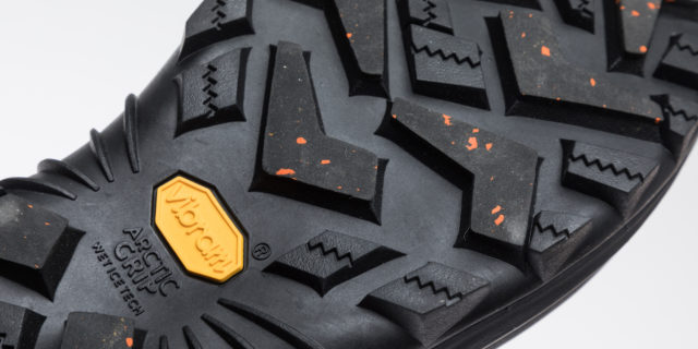 アウトソールにレイアウトされた、赤い穴は排水用。水はミッドソールを経由して、ここから外に出ていきます。このアウトソールには濡れた路面でもしっかり捉えることができるよう、特殊な切れ込みと深いラグが与えられました