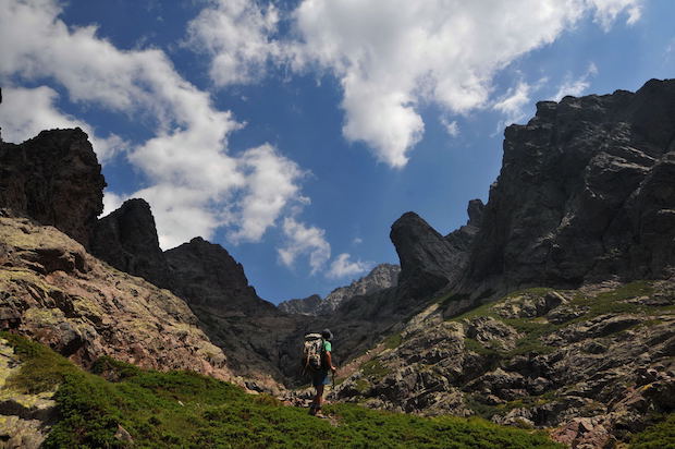 ヨーロッパを代表するトレイルであるGR20。その核心部は、コルシカ島の最高峰モンテ・チント(2706m)の懐へと続く、大聖堂のような深い谷。photo by Hideki Hoshino