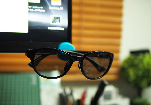 テンプルには磁石が内蔵され、別売りのベースを使えばいつも使う場所にホールドする事が可能だ。僕はPCモニターに取り付けている。