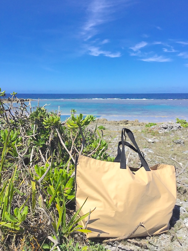 この一重構造バージョンは、海のためにつくったのではないかと思ってしまうほど。また、一枚に広げてトランクに敷き詰めれば防水シートにもなるし、トートバッグとしての大容量と使い勝手のよさは言うまでもなし。