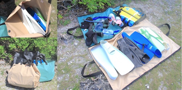 使ってみたのは、ターポリン一重構造の完全防水モデル。サイズちがいの3タイプだ。#16のリップル(Ripple)、#17のルードムード(Rude Mood)、#18のフリーバード(Free Bird)で、それぞれ大型(バッグ時寸法:W44×H37×D22cm)、超大型(同:W56×H46×D24cm)、超超大型(W66×H54×D30cm)。これだけサイズが大きければ、フィンでもマスクでもブーツでも必要人数分が楽々と収まってしまう。海に行く人数によって、サイズ選びをするのがいい。
