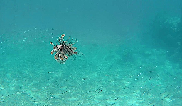 宮古島の海で出会ったミノカサゴ。背鰭には猛毒があるので、要注意! それにしても碧い波間を優雅に漂う姿には思わず(心が)痺れてしまった。