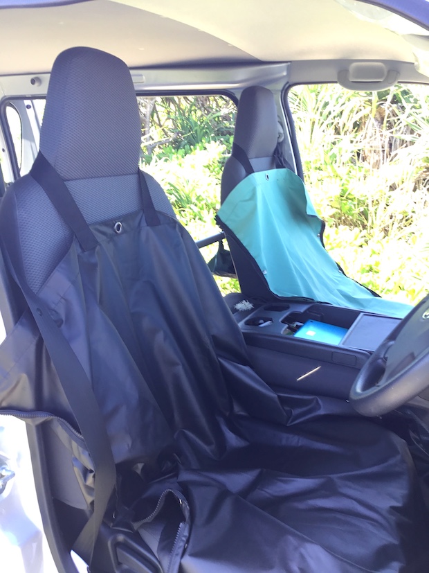 しかも取っ手となるハンドルを座席のヘッドレストにヒョイと掛けるだけで、座席の防水対策が完了してしまうのだ。これは、便利。一重構造なので、合わさった布がズレるようなこともなく、すわり心地も完璧。さらに突っ込めば、ハンドルが口の一部だけで取り付けられており、本体の縁のみにしかステッチがないので、水が染み出してしまうようなこともない。