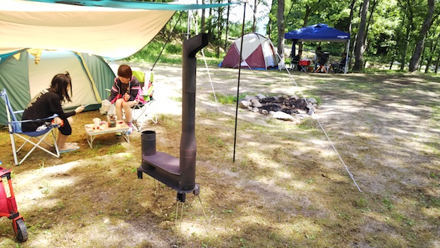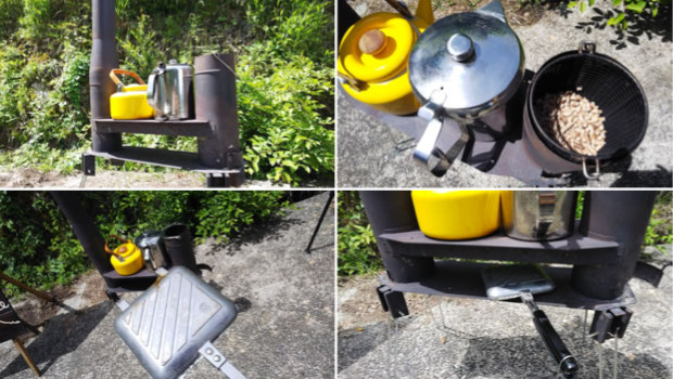 天板部分に鍋や、やかんを乗せることができるようになっている。ここでストーブ料理ができるということだ。さらに凄いのが、この天板の下のベース板にもフライパンなどを置くことができる。上火になるので、ピザなどが焼ける。それよりも、絶好のホットサンドメーカー置き場なのだ。ホットサンド愛好家のみなさん! これいい! 私もホットサンドメーカー買いますw
