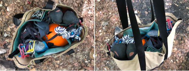 内側にポケットが6つあるので、細かいクライミングギアをここに入れ、種類別に整理し収納できます。これは二重構造ならではの特徴。さらに、二重で持ち手がボトム近くまで延びているため、一重タイプより耐荷重性にすぐれます。ロープって1mで50gくらいあるから、60mだと約3kg! この重さを持ち運ぶなら、耐久性・耐荷重性に優れる二重タイプのほうがオススメってわけです。