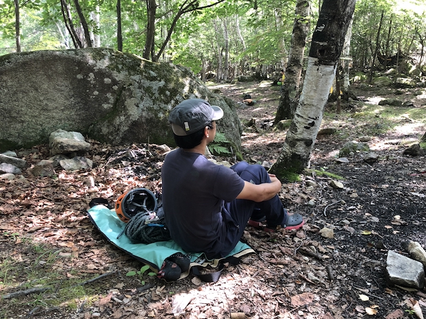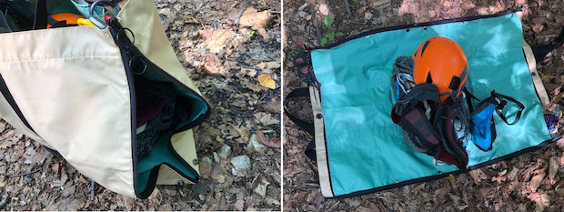 このトートバッグ、ポケットに物を小分けして持ち運べる、というだけがオススメの理由ではないのです。前回の記事を見た人はお分かりでしょうが、横のファスナーを上げフルオープンにすると、平たい一枚布に早変わり。ということは、バッグを抱えて駐車場から歩いて岩場に到着し、バッグを置くと同時にファスナーを上げれば、もうそこは自分のスペースに! 休憩はお昼食べる時だけ、岩場に行ったらガンガン登らないと、ってクライマーには最適です。