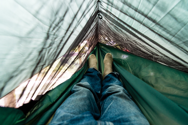 風が吹けば背中を撫でていき、ゆりかごのような程よい揺れが眠りを誘う。自然と一体となって眠ることができるのもハンモックテントの醍醐味。写真はヘネシーハンモックの代表モデル「エクスペディションA-SYM ZIP」(25,000円+税)