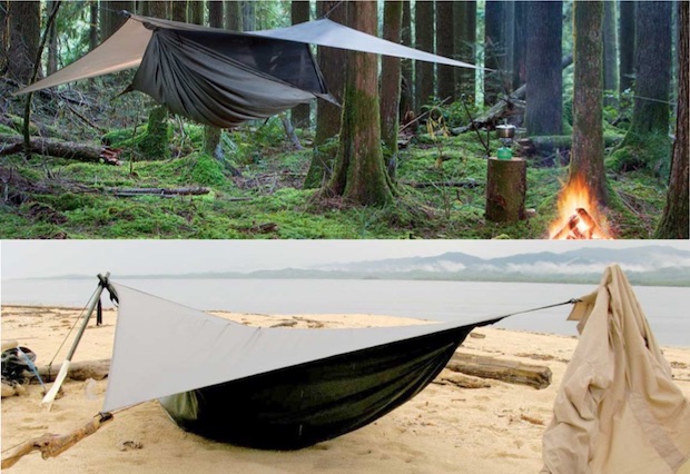 (上)タープを広げれば雨天時でも調理ができるほどの広さを確保できる。(下)お尻は地面に接地してしまうが、トレッキングポールや流木などを使ってでも設営が可能。