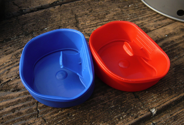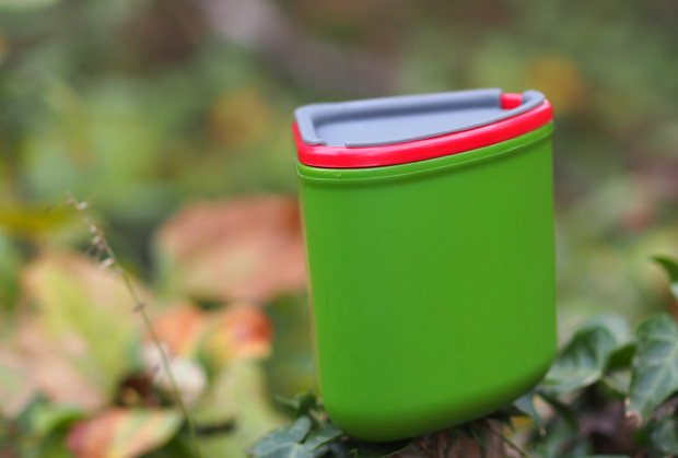 一番よく使っているのがこのフォールドアカップ。25グラムと軽く、ペコン! と半分に折り畳め、ほとんど荷物にならない点が気に入ってる。ボクはラーメンやフリーズドライ食品の水計量のために油性ペンで目安を書き込んでいる。薄いカラーは水が透けるので正確に測れる。軽量で機能面では文句なしのカップだが、味気なさはダントツで家ではまず使わない。