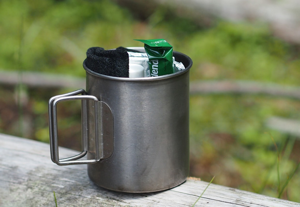 続いてよく使うのがシングルウォールのチタンカップ。こちらも実用重視。ボクの場合、金属のカップはテント泊時など、のんびりと温め直しながらアツアツのコーヒーを飲みたい時によく使っている。チタンを選ぶのは軽さはもちろん、温め直した時にフチが冷えるのが早く、唇を火傷しづらい点だ。軽く丈夫で味も変わらず雰囲気も良い。バランスは一番良い。問題があるとすると価格が高いこと。