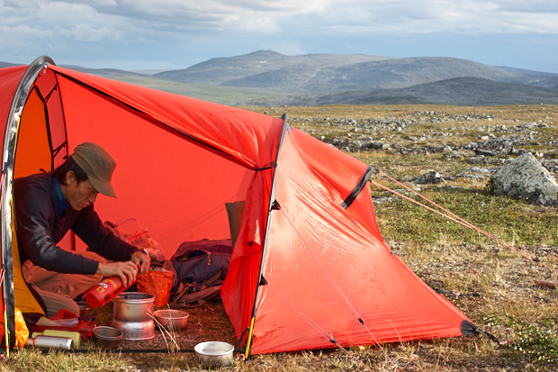 ヒルバーグの故郷、スウェーデンを代表するロングトレイル、クングスレーデン450㎞を歩く。テントは2人用モデル、ナロ2GT。広い前室にバックパックやシューズなどの荷物を置けて、調理もらくらくできる。