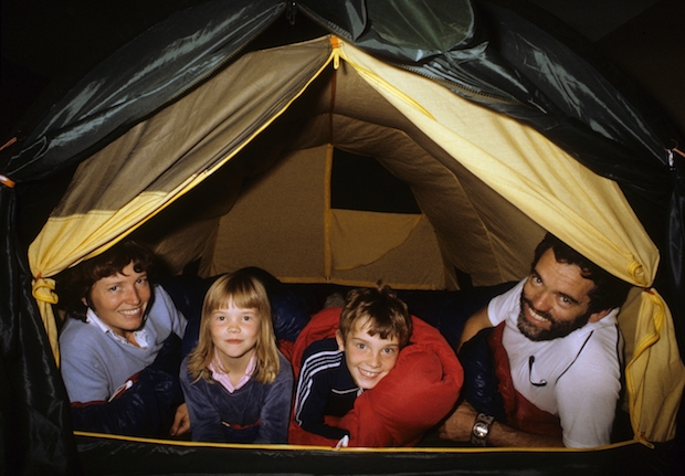 父が作ったテントでくつろぐヒルバーグ一家。右が創設者のボー・ヒルバーグ。左から妻のレネー、娘であり現CEOのペトラ、息子のロルフ。こうしたファミリーキャンプがヒルバーグの原点である。