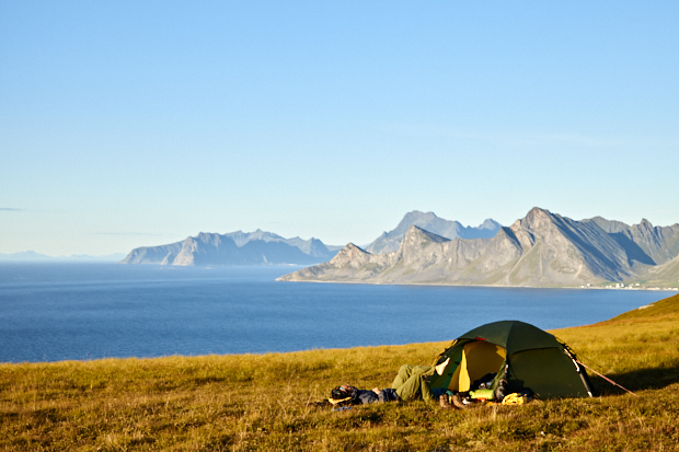 2014年夏、ノルウェーの北極圏、ロフォーテン諸島をキャンプ道具を背負って100㎞ほど歩いた。テントは2人用の自立型、アラック。砂礫のような不安定な地面でもポールを3本ドーム型に組んで、耐久性を保てるモデルだ。