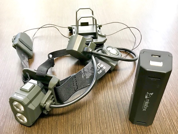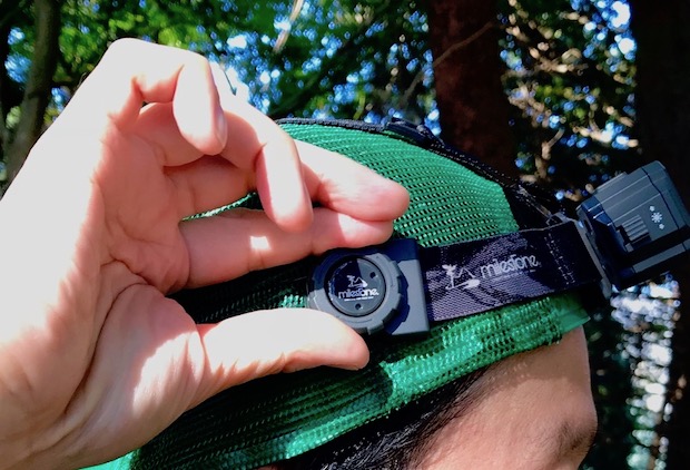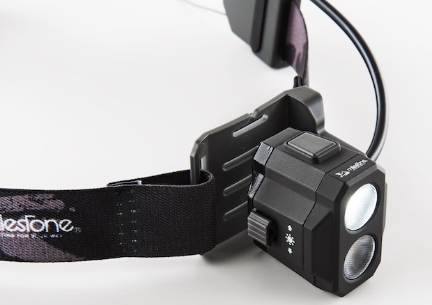 そうこれが「マイルストーン トレイルマスター」。ひたい側のライト部分と後頭部の充電池をつなぐバンド部分はクイックダイヤルシステムにより素早く装着が可能で、かつ絶妙な装着感と前後バランスを備える。見た目にとても重厚感があるから、着用するとその軽さに驚く(笑)。