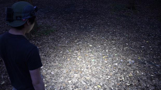 登りでスピードが落ちる時や、凹凸の少ない平地では(中)モード160ルーメンでもそこそこ足元を照らせるだろう。そして、160ルーメンの状態では約7時間の使用が可能だ。