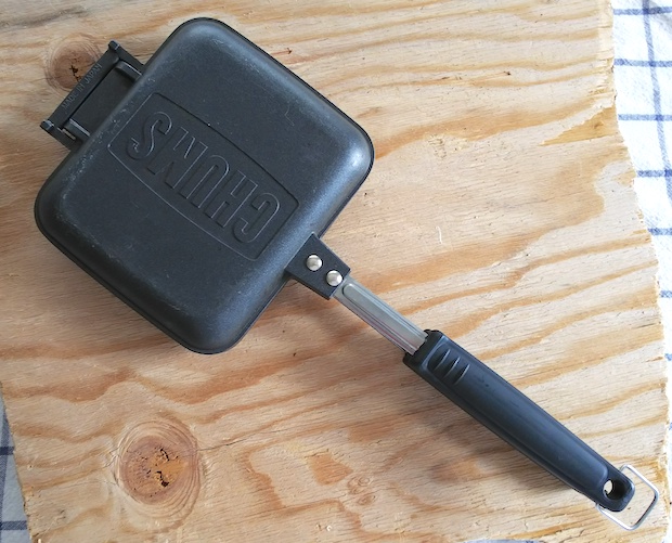 これは後日の話となりますが……探し出すにあたって、いちばん気にしていたのはお値段でした。でも材質とかによって値段は変動するのかなと思い、次に注目したのは材質。鉄、アルミ、フッ素加工、焼き加減とお手入れのしやすさが変わってくる。あとは重さ! 最初にも挙げましたが、軽くてもぜんぜん問題ないんです。ただ、プレス加減がちがう。パンに具材を挟み、パンを乗せてプレス! このプレスのされかたによりパンの焼きあがりが変わってくるのではないかと。そして取っ手部分の素材です。焼くにあたり、焚き火で、バーナーで、ガスレンジなどで、どんなシーンで焼くかにも変わってきますが、持ちやすさは重要です。また、ヒンジ部分は取り外しやすいかということ。材質、重さ、取っ手、ヒンジ、この4点を見極めて……。