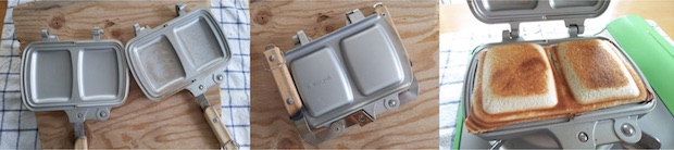 あ、やっぱりスノーピークさんですよね。でもお値段なりの機能が詰まっているのです。そう、他にはない、取っ手が折りたためるという機能がついているのです。収納という点でこれは大きいです。どのメーカーのものも案外長い取手がついています。それがトランスフォーマーのごとく折りたためるのです。収納する専用袋もあったりして。そして、2枚同時に焼ける! やばい、これは欲しくなるわー。ただ、サイズ的に耳を落とした食パンじゃないと入りません。そこがカリカリになるのでおいしいんですけどね。