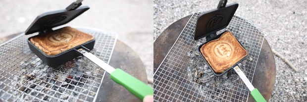名称のキャンプクッカーというように、ホットサンド限定ではなくスナックや肉なども焼けるようになっているとのこと。アルミにテフロン加工がしてあるので、洗いやすいのも〇です。おもったよりもプレスしやすく、コンパクトなりの使い勝手。あえてパンを出して耳を焦がしてもいいのかも。ただ、今回はびびって小さいパンでつくってしまいましたが。焚き火で焼くということで、気になってちょこちょこひっくり返して焼くんです。でもそこが楽しい、マシュマロを焼いているのと同じですね。