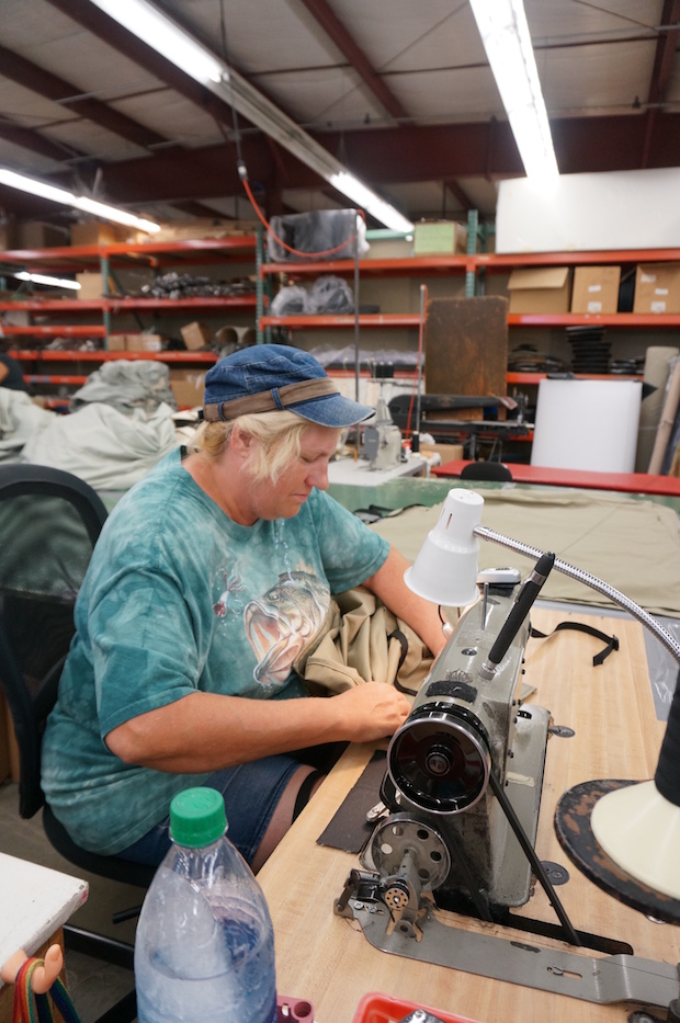 店舗の裏にある自社工場でミシンを踏む縫子役のおばあちゃん。先代の社長時代から勤めている人も少なくない。カーカムスのテントが受注生産なのは、こうやってひとつずつをていねいに仕上げているから。