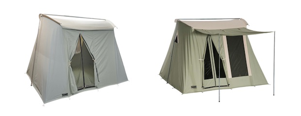 2本脚がシンボルスタイルのカーカムステント。左が「スプリングバーテント アウトフィッター3(税込102,600円)、右が中国で生産されている「ハイライン6 スプリングバーテント(税込149,040円)