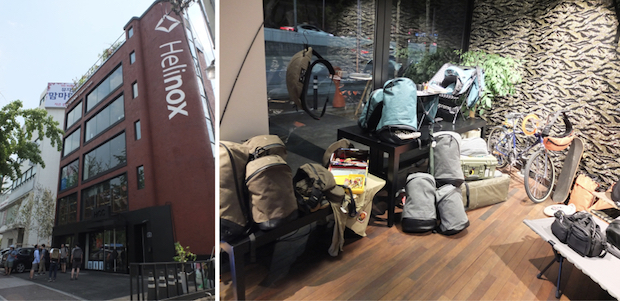 左/韓国にあるヘリノックスのヘッドストア 右/ストア内にはヘリノックスの製品とともにターグのバックパックが並ぶ。自転車やスケートボードが一緒にディスプレイされるなど、そのプロダクトコンセプトがストリートにあることが見て取れる