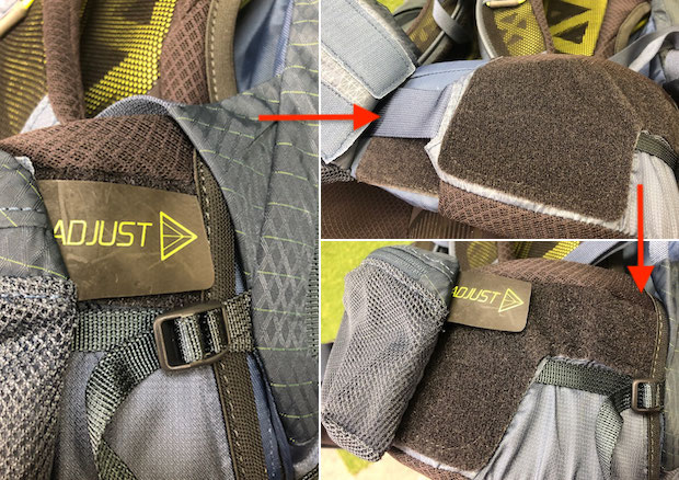 ヒップベルトの付け根にある「ADJUST」の黒いベロををめくりあげると簡単にベルトの長さを調整できます。ほんの数秒で6㎝も長さが変えられました。