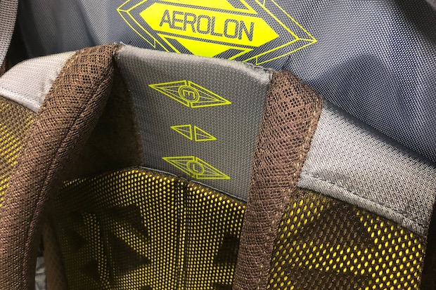 さて、パラゴンの最大の特徴といえば「エアロロン(AEROLON)」と呼ばれる背面に施されたテクノロジーです。このテクノロジーのうちのひとつ、超軽量なアルミニウム合金シャーシと、吸湿発散メッシュに穴の空いたバックパネルとショルダーハーネスにより、この、軽量かつ快適なバックパックを実現しています。