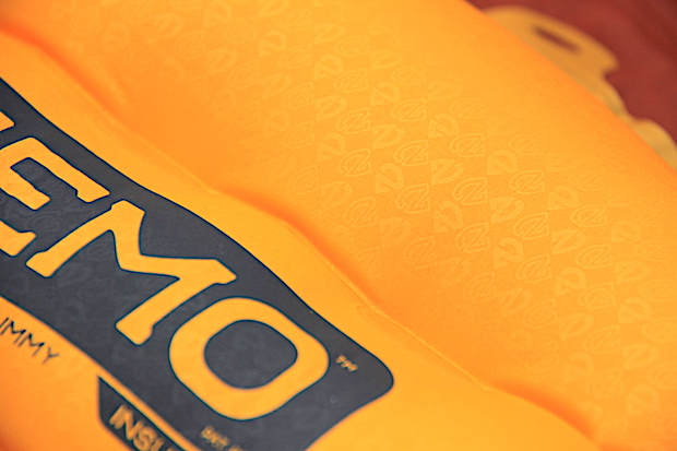 マットの表面生地は20デニールのPUポリエステル。よ〜く見ると、細かくニーモのマークが連打されていたりして。じつは、これ表面の滑り防止にも役立っている。