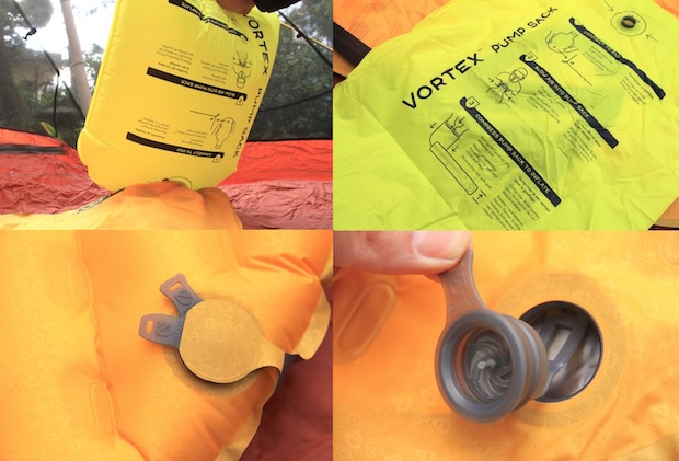 空気の入れ込み方法は昨今人気のポンプサックを使ったもので、バルブにサックをセットすれば、だいたい2回半もあればマットはパンパンに膨れ上がる。慣れればいとも簡単にできる。さらに、膨らみ具合の微調節も寝ながらにして指先ひとつでできるので、お手軽なことこの上なし。