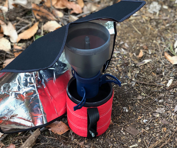 やはり野外では風があると冷えてしまう。熱々のドリップコーヒーが飲めるかも!? と期待して購入したが、どちらかと言うと、お湯を入れて放置するだけでドリップコーヒーが作れ、持ち帰りも楽で便利なコーヒードリッパーとして活用している。熱々のコーヒーはシングルウォール金属カップで温め直すのが一番良い。