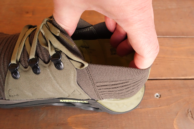 さすがニット。履き口はこんなに広がって、足入れも超イージー。なのにしっかり足首周りを締めてくれるなど、シューズのアッパー素材としてはいい事だらけ