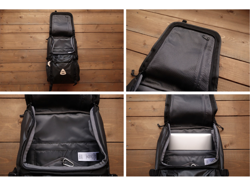 左上/開口部はこんなふうに大きく開きます。メインコンパートメントの奥が暗くて見えにくい、ということもありません。このあたりは開口部の大きなバックパックを使ってみて初めて、今までの不便さを思い知りました 右上/開口部の内側はメッシュポケットになっています 左下/奥から多目的スリーブ、タブレットスリーブ、そしてオーガナイザーポケット。ポケットの近くにはカラビナも備えています 右下/PowerBookの13インチをしまった状態。撮影のため、完全には収納しきっていない状態です