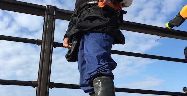 ウエストはベルクロによってサイズの調整もでき、ベルト要らず。さらにWAYFARERはアドバンスドスキンシールドというテクノロジーを採用している。完全なシェルとして使えるわけではないが、素材の目が密に編み込まれ風を通しにくく、フィールドでの活用範囲はかなり広い。また、このパンツのニクいところはブルーサインにも認証されていることか。