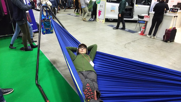 UPIの寒川さん。ふだんからハンモックを使ってよく眠っているというだけに、斜め寝の動作にも無理がない。人は快適さにこだわるものなんですね。