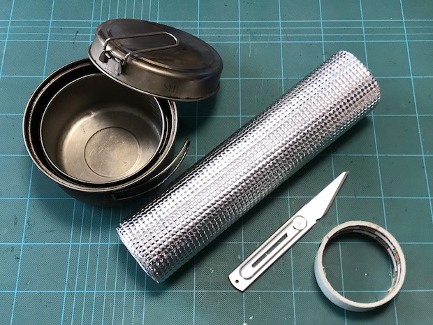用意するのは覆いたいクッカー、ナイフ、両面テープ。写真にはないがこのあとダクトテープも追加した。美しさを追求する人は、テープにアルミテープを使おう。