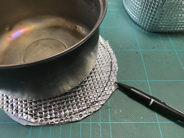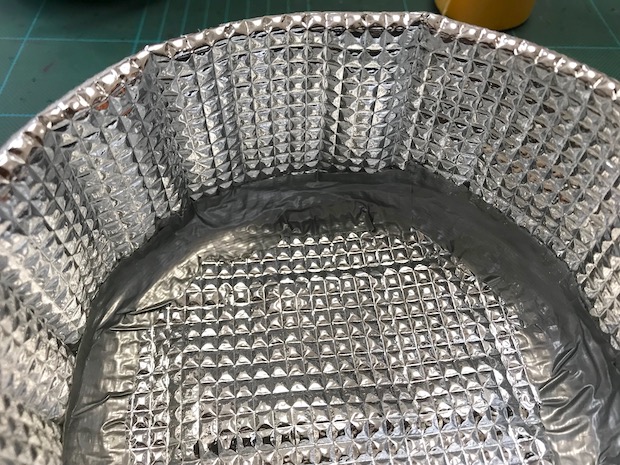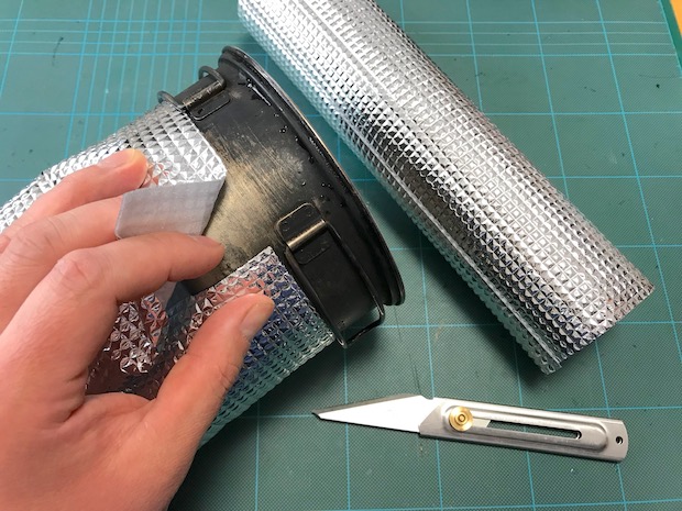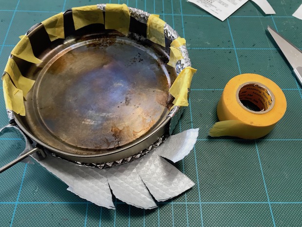 筒状に立ち上げた側面パーツの中に、切れ目を入れた底面パーツを押し込み、ダクトテープでぐるりと接着。これでクッカーの鍋側のコジーが完成。