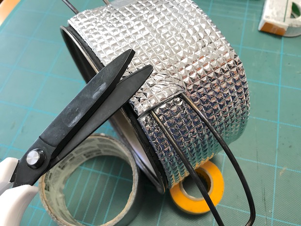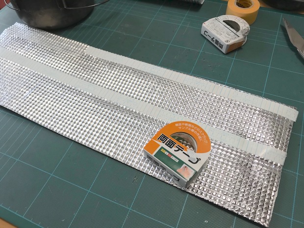 ここからはクッカーに現場合わせでシートを切り貼りしていく。今回の銀シートは厚みが2mm弱だったので、全体を4層にすることにした。まずは側面を覆う細長いパーツを切り出す。