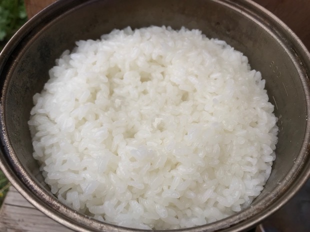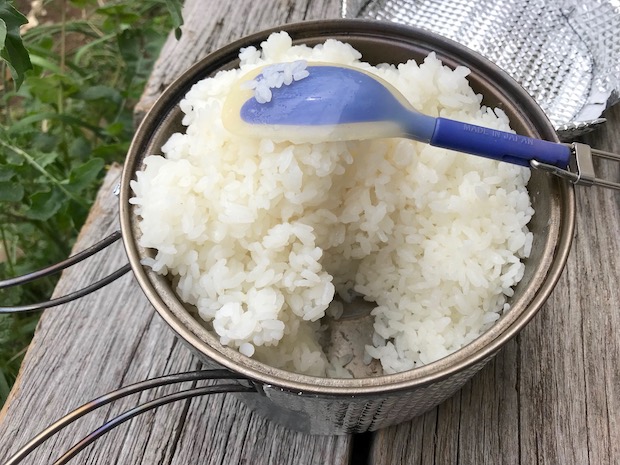 一般に、熱伝導率の低いチタンのクッカーは炊飯が苦手だが、水気が少なくなったタイミングでコジーに入れることで、鍋底を焦がさず、かつ芯飯にせずに炊き上げることができる。