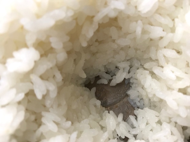 10分後、白飯をチェック! 真ん中も周辺部もまんべんなく炊けている。それでは、底はどうか。
