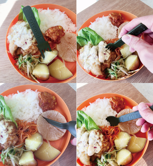 ランチでいろいろな食材で使用してみましたが、使っていて不便さを感じなかった。フォークで、唐揚げやサツマイモをぶすりと突き刺しても、当然折れない。