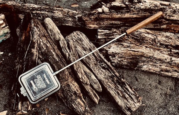 内部がコーティングされたアルミパンに長いハンドルを取り付けた焚き火用クッカー。焚き火の熱や火の粉を気にせずに調理することができ、ホットサンドや酒の肴を作るのにちょうどいい。山に持って行く時はトレッキングポール用のループを使ってバックパックの外側に取り付けると便利。
