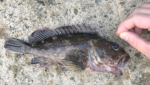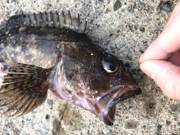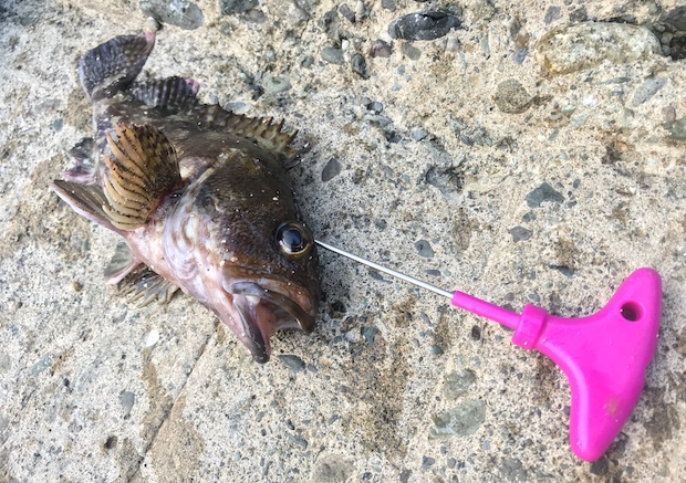 魚を獲ったら、魚の眉間をスパイクで一撃。魚種によって異なるが、両目の後端を結んだ線の中心部やや後方に脳がある。ここへスパイクを入れて脳殺する。苦しませないよう、手早く締める。