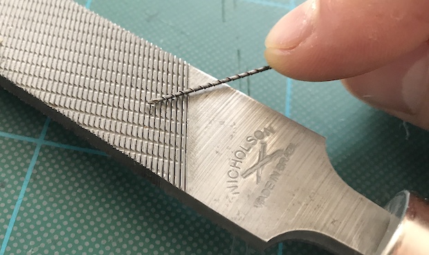続けて、どこのご家庭にもある金ヤスリで切り口のバリを丸めよう。先端は尖らせず、角をとるだけでOKだ。鈍いくらいがちょうどいい。