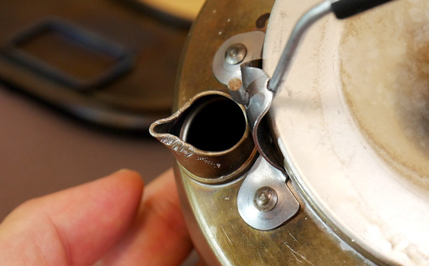 まずは定番のヤカンの口をペンチで潰す。コーヒーを淹れる時に細くしたい! そんな時にペンチで潰すと気持ち細く入れられる。