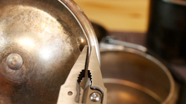 最後は定番のブラブラするクッカーのハンドルやつまみをちょっとだけ固くする方法。根元部分をプライヤーで閉めると好みの硬さに調整ができる。ハンマーで潰してもOK。これで加熱中に自然と収納位置に戻り、熱くなって持てなくなることが減るだろう。