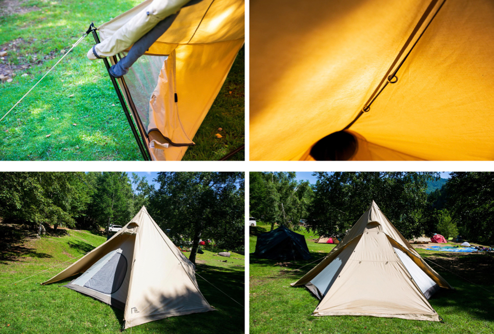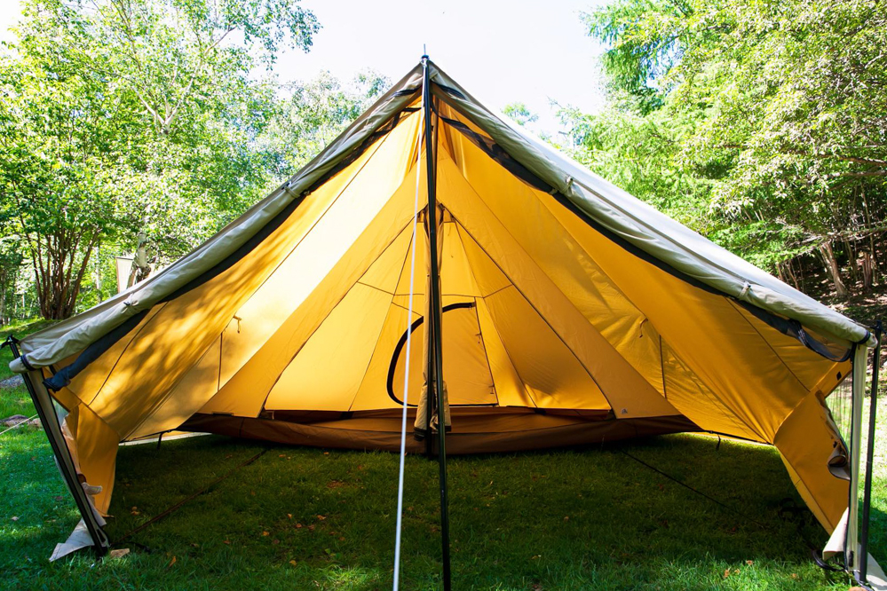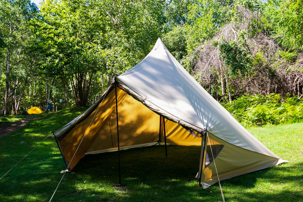 シェルターの開口部は大きく、出入りにもストレスはない。ワンポールテントの形状を基本にしながら、入り口と左右にサブポールを備えることで、デッドスペースを消し去った。