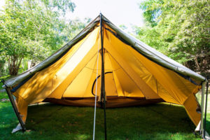 中に入った第一印象は、とにかく開放感があることだ。ワンポールである以上、天上が高いのは当たり前。そこに加えて壁がスッと立ち上がっていることで、テントの端まで背をかがめることなく歩いていくことができる。シェルターというより、これは布でできたキャビンだ。その余裕に溢れた居住性には感動さえ覚える。