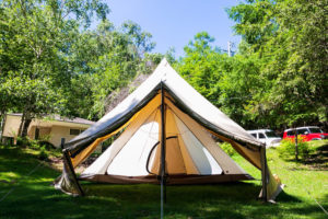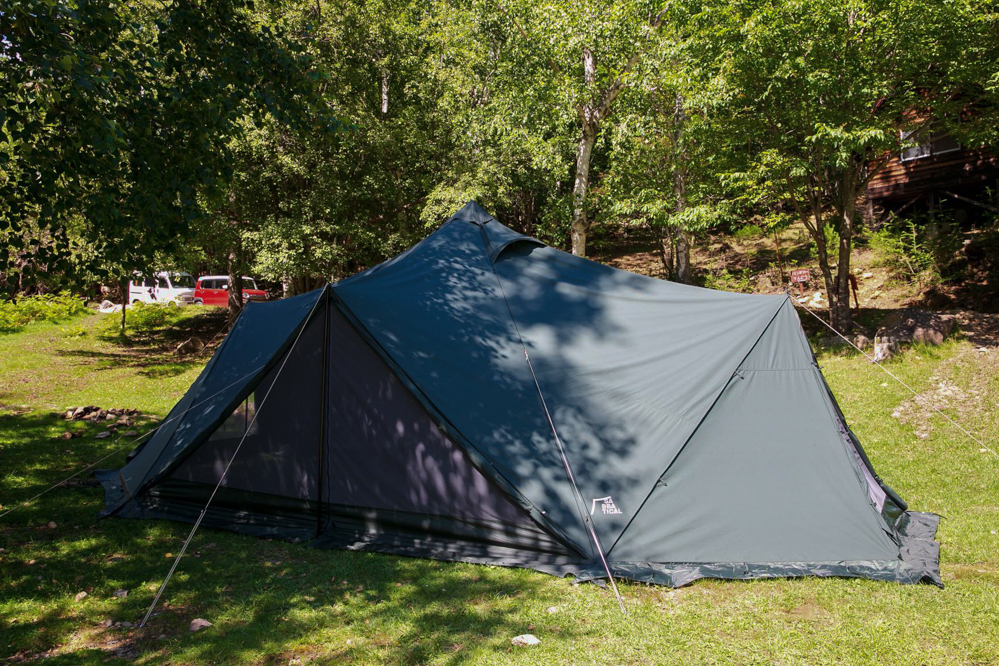 取材の日は誰もが日陰を探してしまうような日差しだった。が、夏の太陽に炙られているにも関わらず、シェルター内は快適そのもの。立って歩くと、シェルター上部に熱のこもりを感じるのは仕方ないとしても、胸から下あたりは非常に快適なのだ。TCコットンの遮光性に加えて、四方に設けられたベンチレーターが高原の風をスムースに招き入れているのがよく分かる。この風通しの良さと、大容積テントだからこその安定した気温は、日本のアウトドアシーンにおいて大きなアドバンテージとなるだろう。